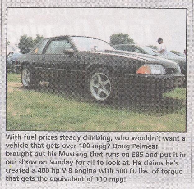 Company President Doug Pelmear has gotten personal visits to his booth in the basement from a number of foreign and domestic auto executives, as well as Michigan Gov. Jennifer Granholm and U.S. Sen. Robert Corker (R., Tenn.), all of them interested in his 1987 Ford Mustang and its custom-built engine that gets the equivalent of 110 mpg.